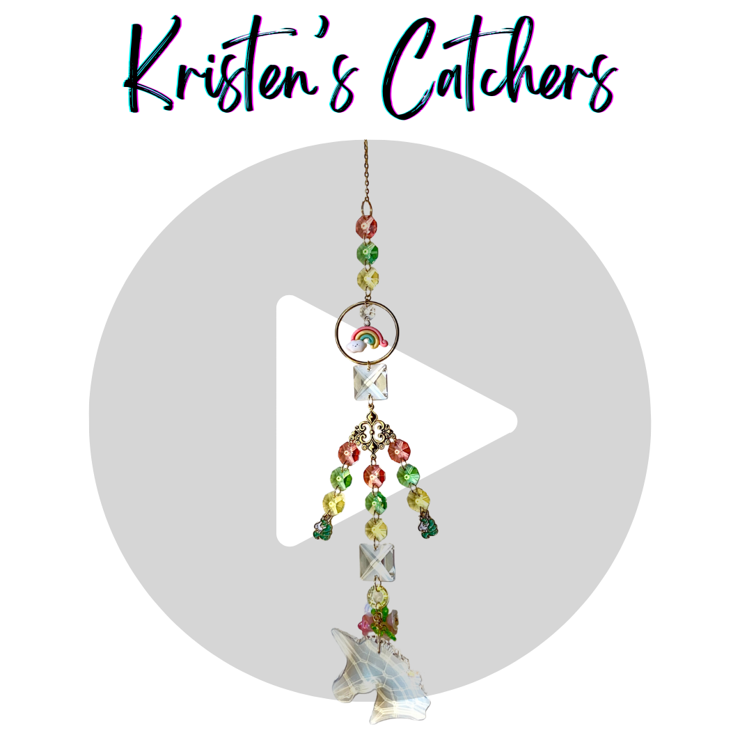 - Large iridescent unicorn-shaped prism pendant at the bottom — geometric, etched, and genuinely one of the most joyful crystals I've ever worked with