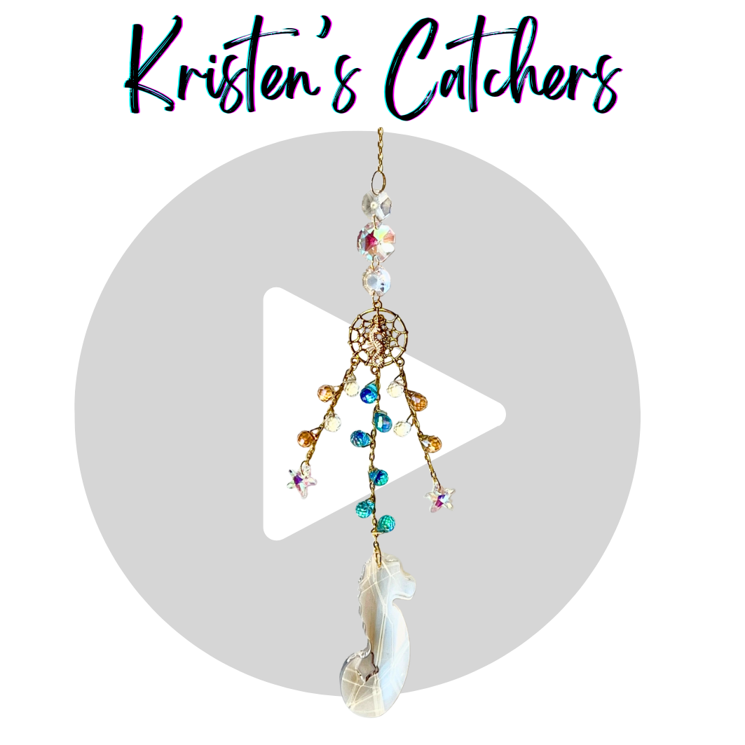 Handcrafted by me in Las Vegas, Nevada — far from the ocean but deeply respectful of it. The fringe on this piece took real time and intention. Every tiny crystal was placed to suggest movement — the kind of restless, beautiful, go-where-it-takes-you energy of water in motion. And that seahorse prism is one of the most special crystals I've worked with. It glows. Genuinely glows.